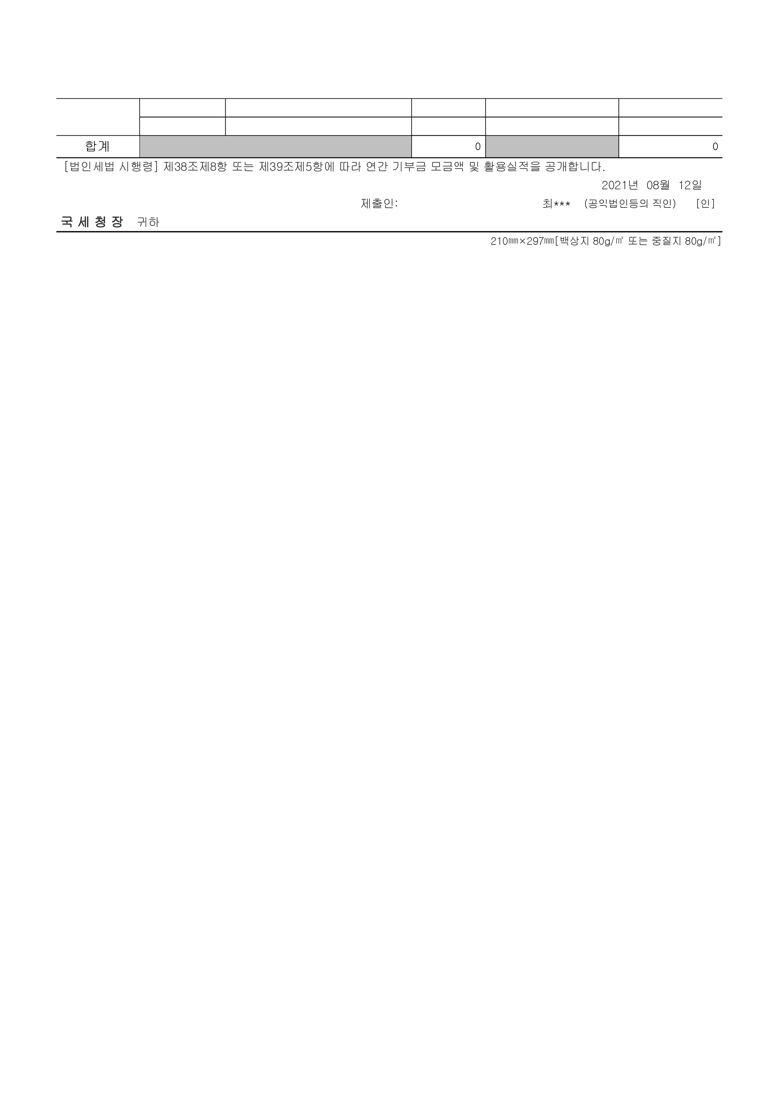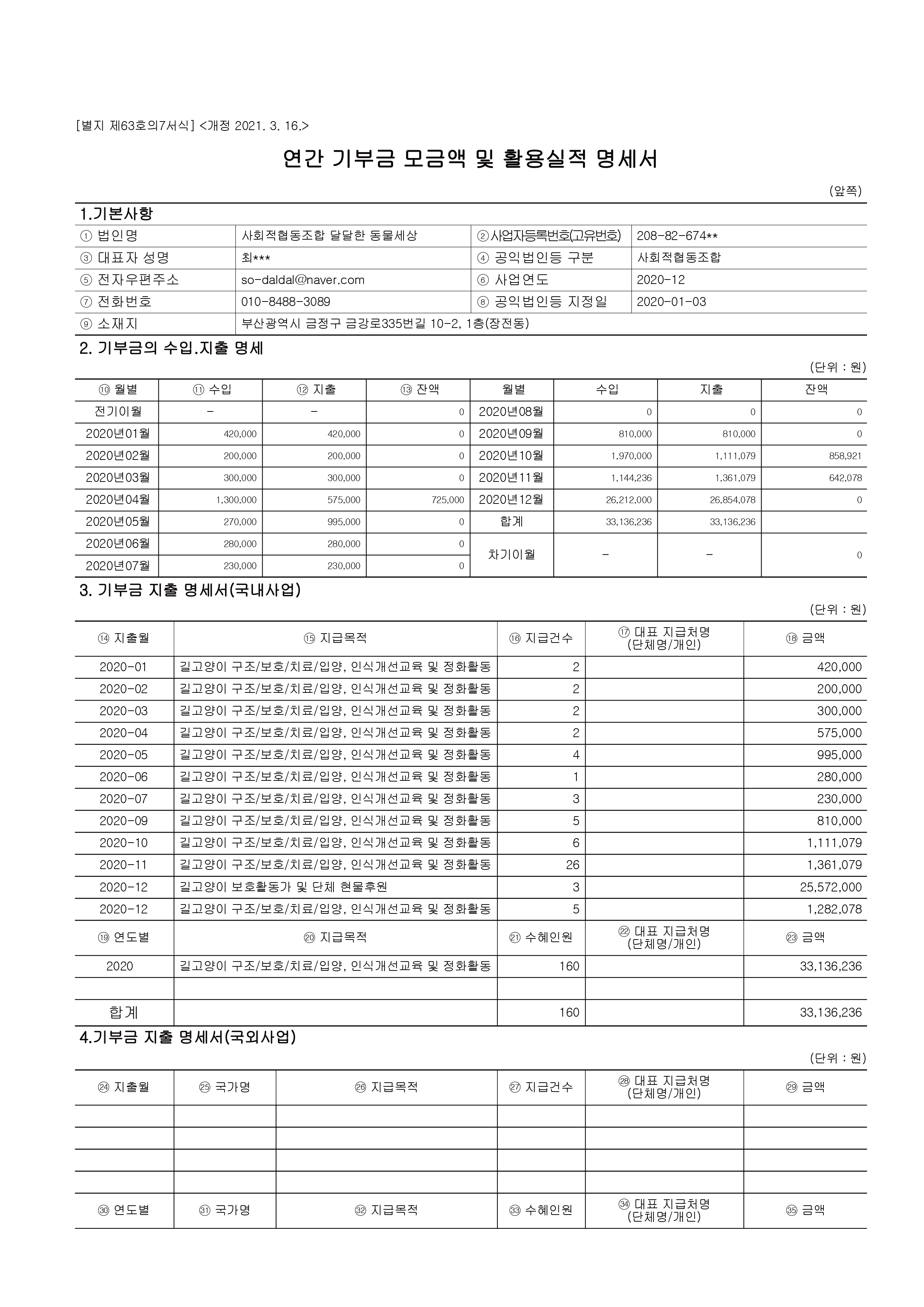 2020년도 연간기부금 모금액 및 활용실적 명세서