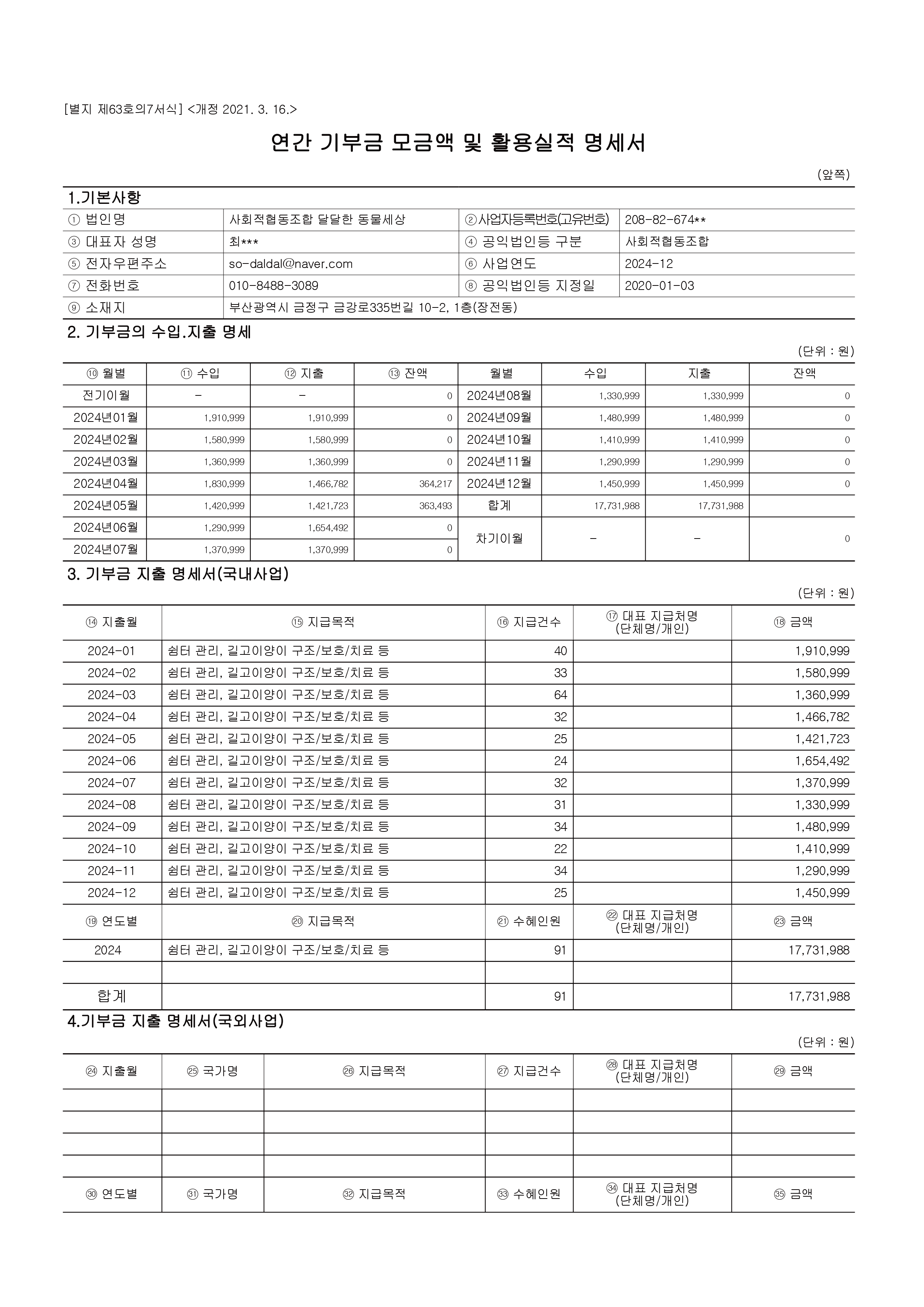 2024년도 연간기부금 모금액 및 활용실적 명세서