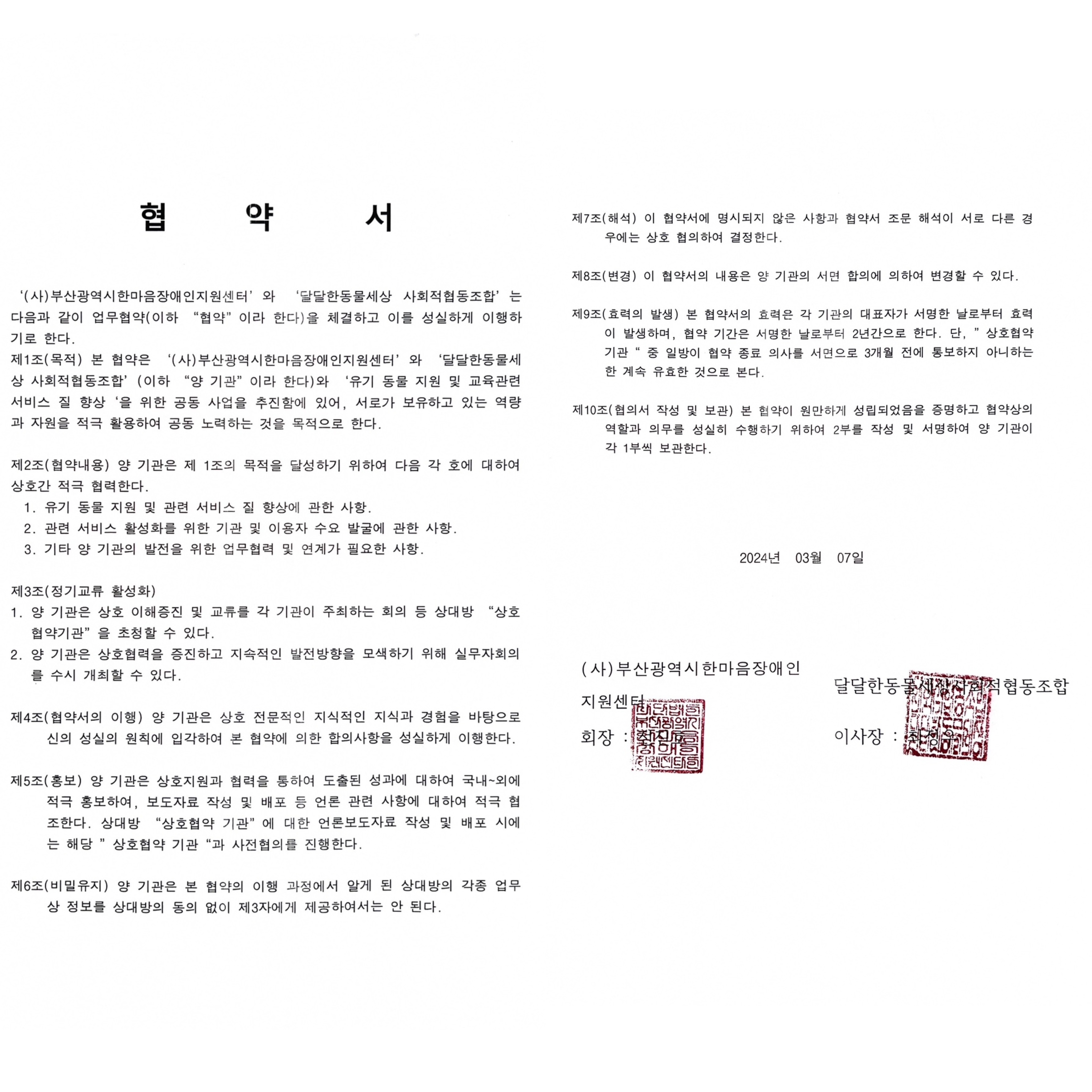 달달한동물세상 사회적협동조합은 - (사) 부산광역시한마음장애인지원센터와